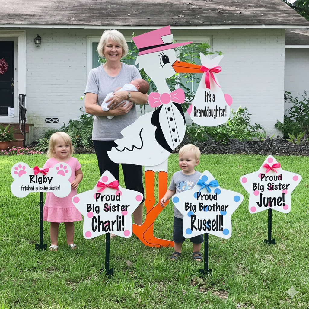 Stork signs aren’t just for birth announcements – they make a beautiful statement at special events like Sip & Sees, Gender Reveals, and Baby Showers too! They’re the perfect way to welcome guests and set the tone for a joyful celebration. Grandparents can also join in the excitement with their own stork sign to proudly announce their new grandbaby. To make it even more special, we offer personalized add-on signs like sibling stars to make big brothers and sisters feel included, and pet signs shaped like bones or cats so furry family members aren’t left out. These keepsake add-ons create lasting memories and make your celebration truly one-of-a-kind.
