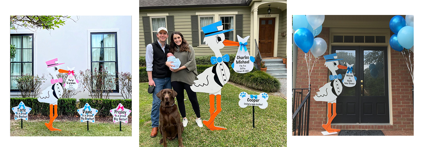 Celebrate your newest arrival with our 6-foot stork yard signs, available for rent in Memphis and surrounding areas! Each charming stork is personalized with your baby’s name, birth details, and colors of your choice — perfect for photos, neighbors, and creating memories that last. Whether it’s a birth announcement or a grandparent gift, our storks make every home feel like the nest of something special. Stork Rental available in Germantown, Collierville, Memphis, Piperton, Rossville, Eads, Lakeland, Arlington, Millington, Bartlett, Cordova, Byhalia, Lewisburg, Hernando, Southaven, Olive Branch
